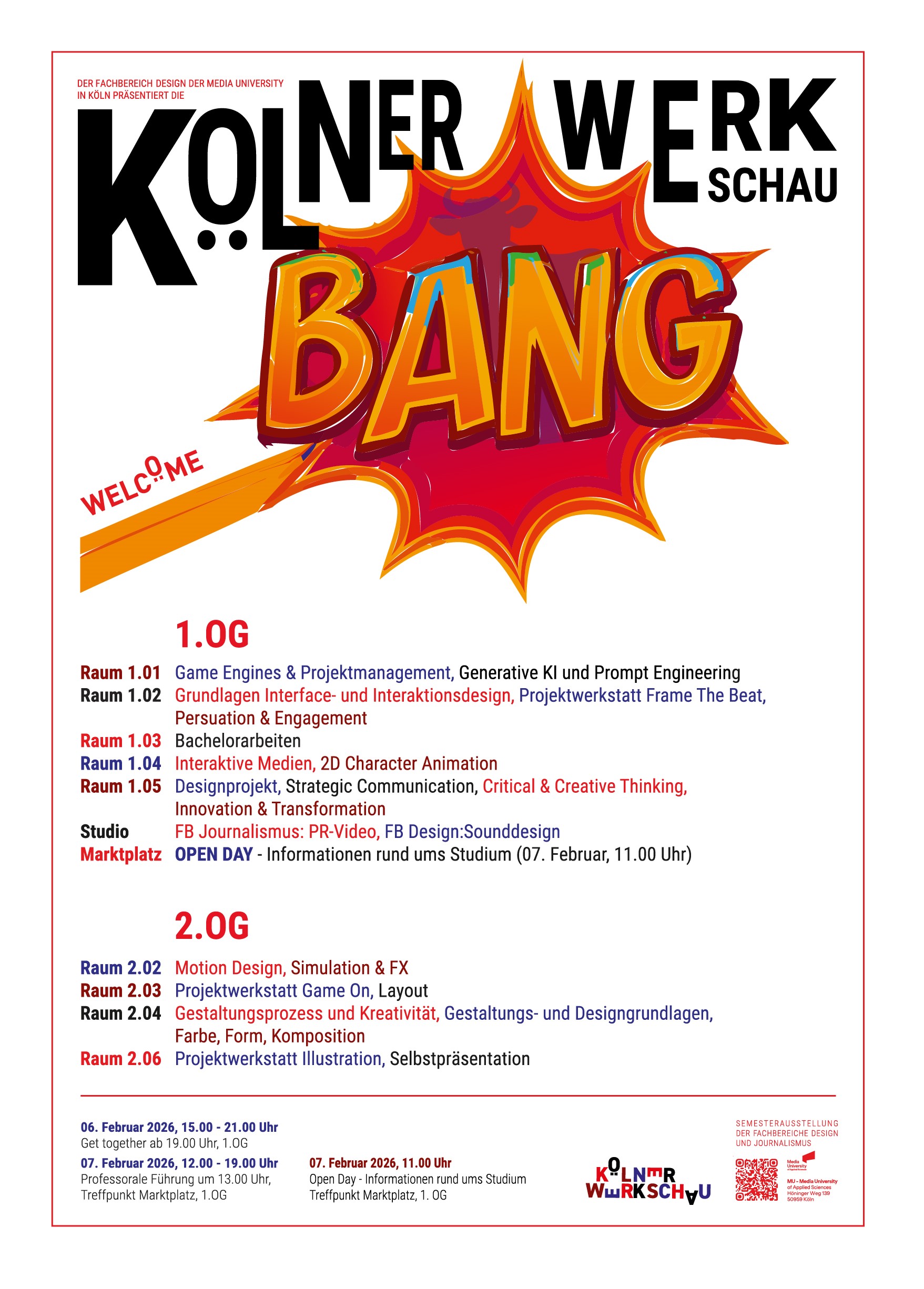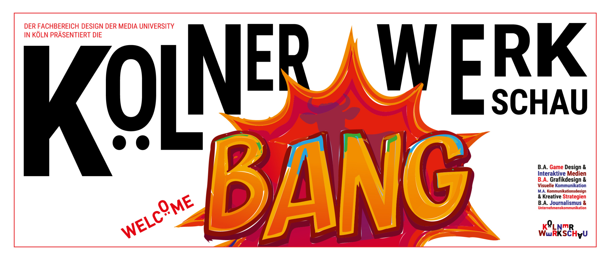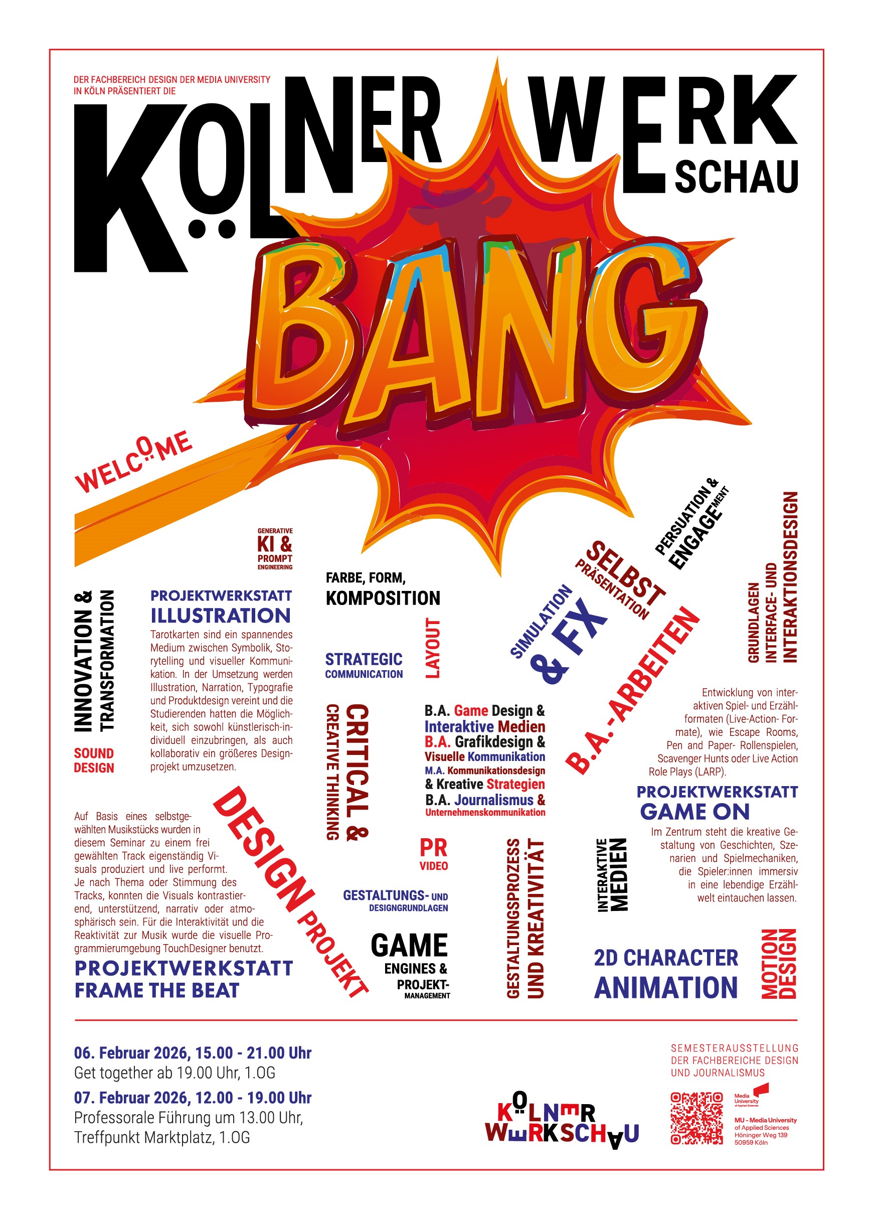 BANG!💥 Am 6. und 7. Februar ist es wieder soweit, die Fachbereiche Design sowie Journalismus und Kommunikation der Media University Köln präsentieren stolz aktuelle studentische Arbeiten auf der Semesterausstellung „Kölner Werkschau“.