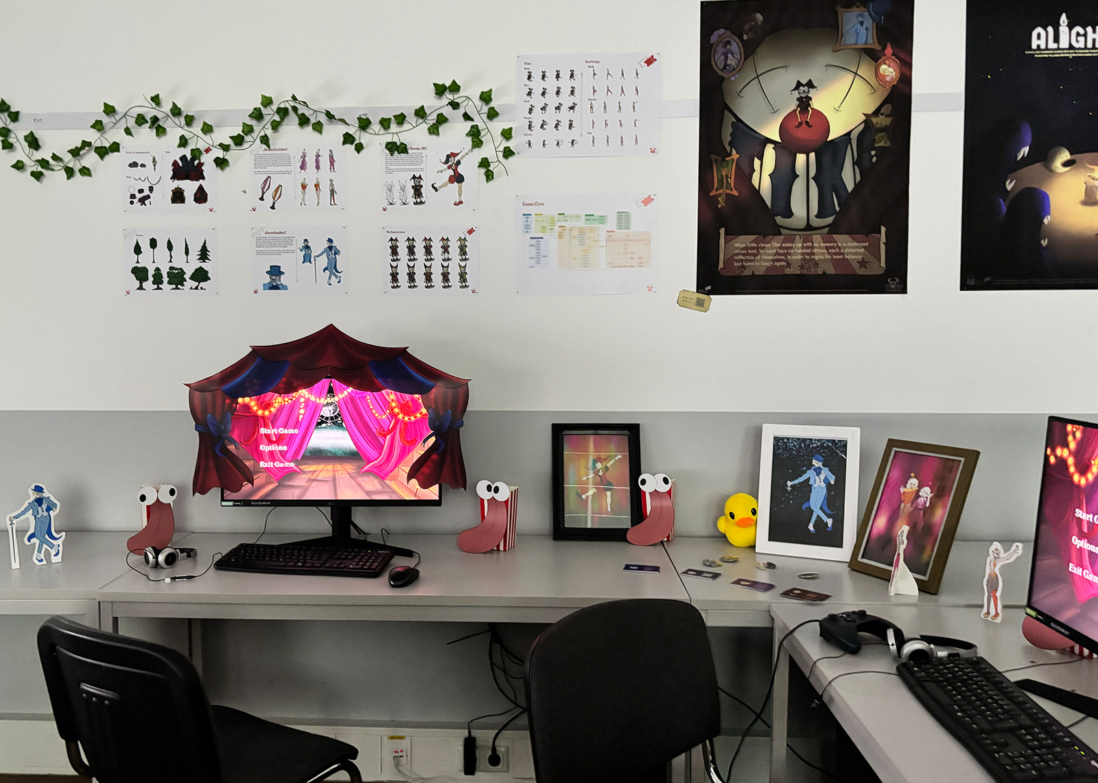 Gezeigt wurden Arbeiten aus den Studiengängen B.A. Grafikdesign und Visuelle Kommunikation, B.A. Game Design und Interaktive Medien sowie M.A. Kommunikationsdesign und Kreative Strategien. Die Ausstellung bot einen vielseitigen Einblick in gestalterische Grundlagen, visuelle Konzeptentwicklungen, UI/UX-Design, Storytelling, Animation, visuelle Effekte sowie zukunftsorientiertes Denken und den Einsatz generativer Künstlicher Intelligenz.